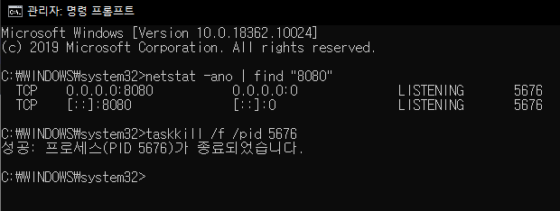 netstat -ano | find "8080"으로 PID 번호를 찾고